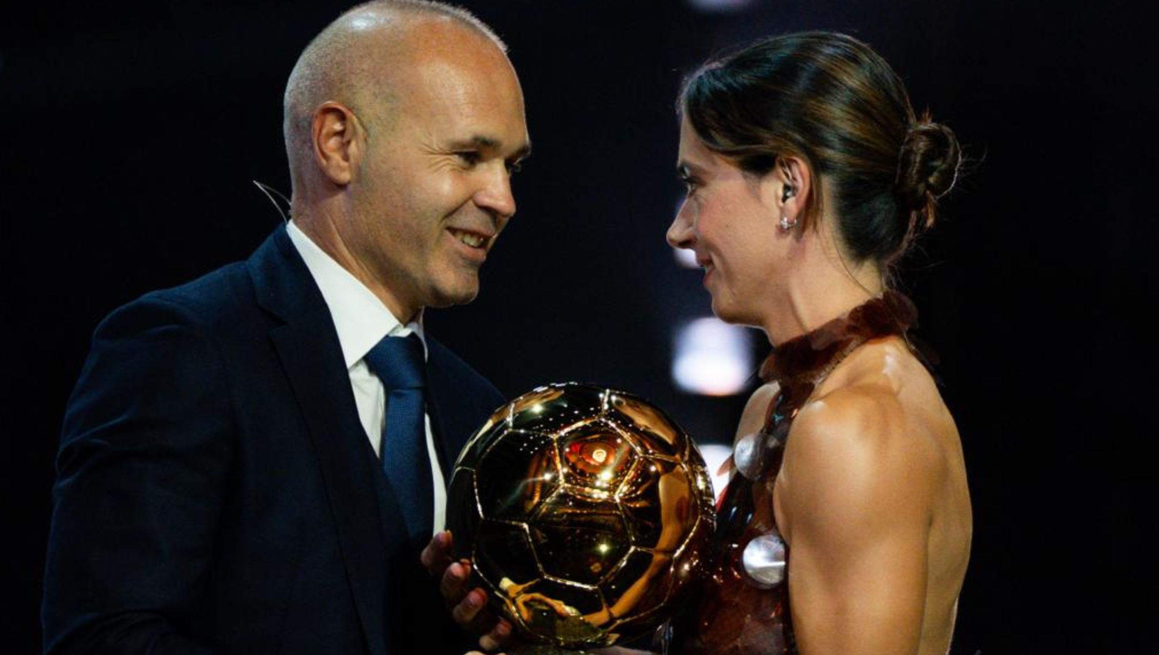 Barcelona legend Andres Iniesta handing over the Ballon d’Or trophy to Aitana Bonmati for her third straight award 🐐 pic.twitter.com/tSXCHf1cBX