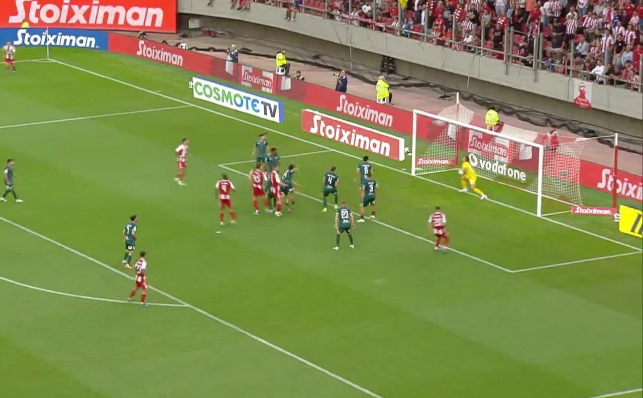 Η μπάλα βρήκε το οριζόντιο δοκάρι κι ένα συνεχεία «έσκασε» καθαρά μέσα από την γραμμή, με τον βοηθό να δείχνει σωστά σέντρα, για το 1-0 της ομάδας του Πειραιά.