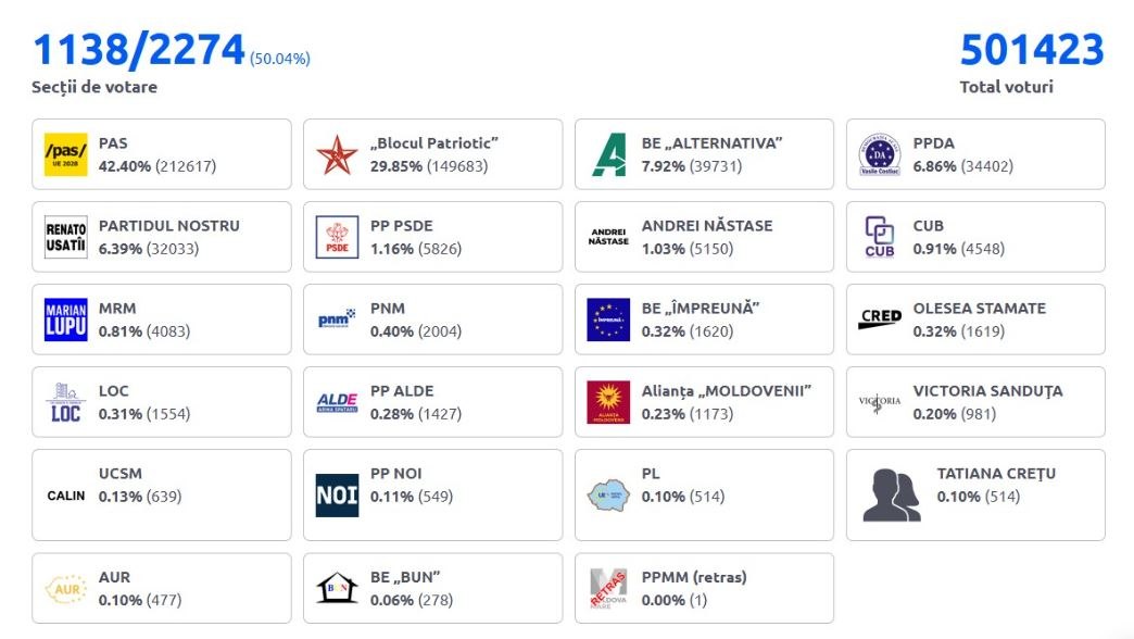 Μετά την καταμέτρηση κάτι περισσότερο από το 50% των ψήφων στη Μολδαβία, το κυβερνών φιλοευρωπαϊκό Κόμμα Δράσης και Αλληλεγγύης – PAS έχει συγκεντρώσει 42,4%. Το Πατριωτικό Μπλοκ καταλαμβάνει τη δεύτερη θέση με 29,85%.