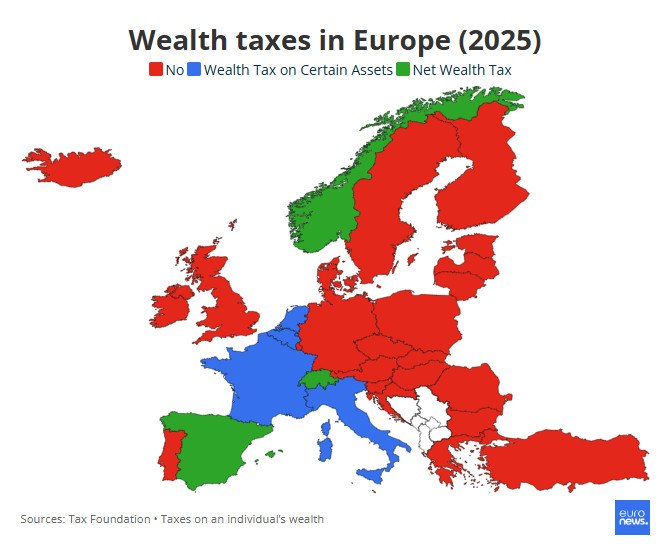 Σύμφωνα με το Tax Foundation, από το 2025, φόροι επί της καθαρής περιουσίας των φυσικών προσώπων υπάρχουν μόνο στην Ισπανία, τη Νορβηγία και την Ελβετία.