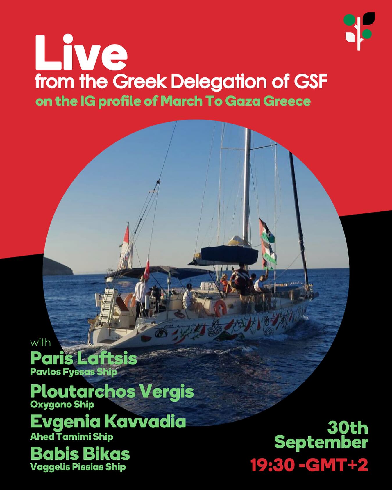 Η εκδήλωση μεταδόθηκε στον λογαριασμό του March to Gaza Greece στο Instagram.