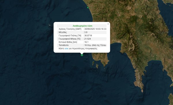 Σύμφωνα με το Γεωδυναμικού Ινστιτούτου Αθηνών, το επίκεντρο εντοπίζεται 16 Χλμ. δυτικά νοτιοδυτικά της Πύλου.