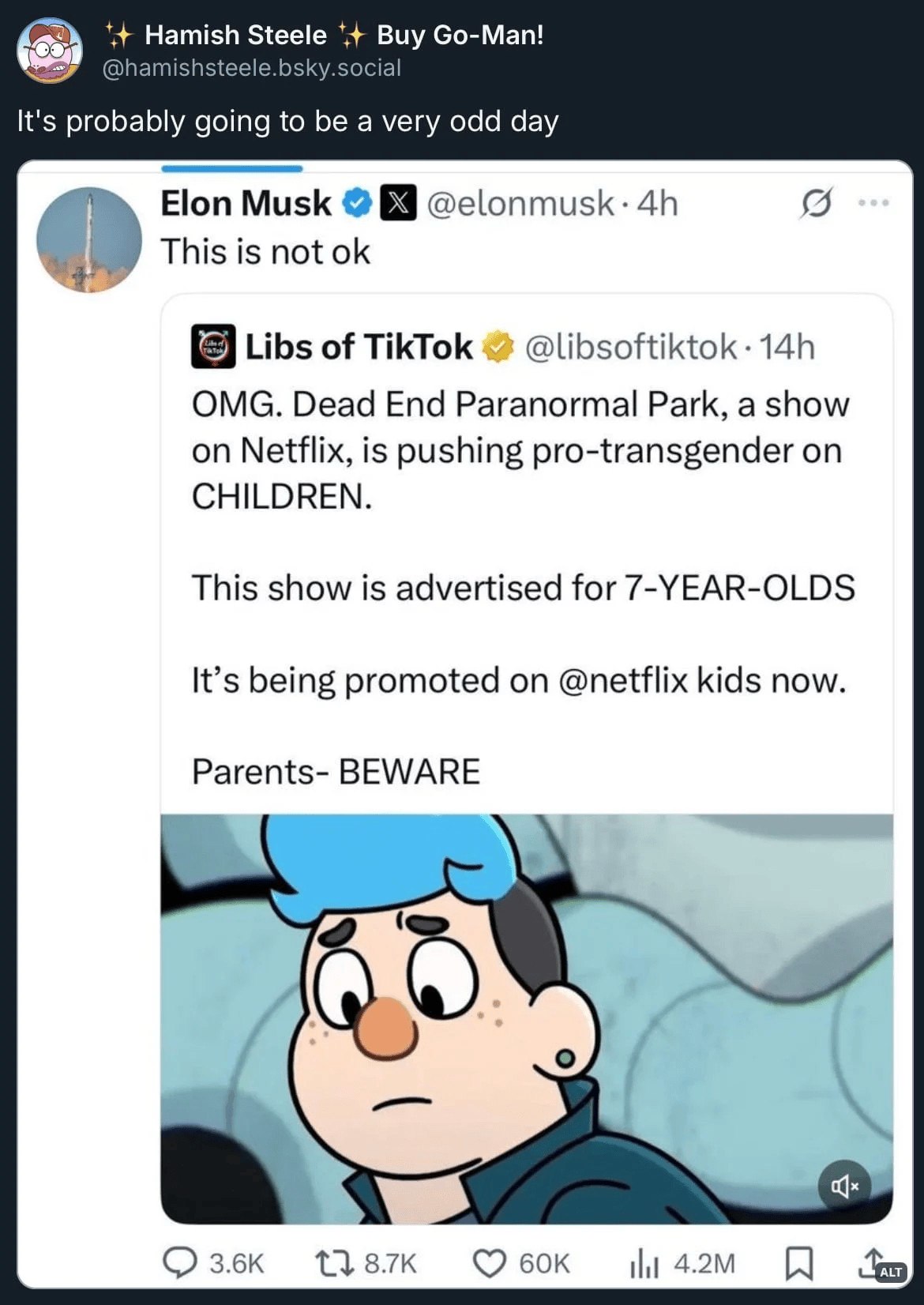 Η προειδοποίηση αυτή ήρθε μετά από ανάρτηση στον λογαριασμό της συντηρητικής δεξιάς των Libs of TikTok, η οποία μοιράστηκε ένα απόσπασμα από την παιδική σειρά κινουμένων σχεδίων του Netflix, Dead End: Paranormal Park.