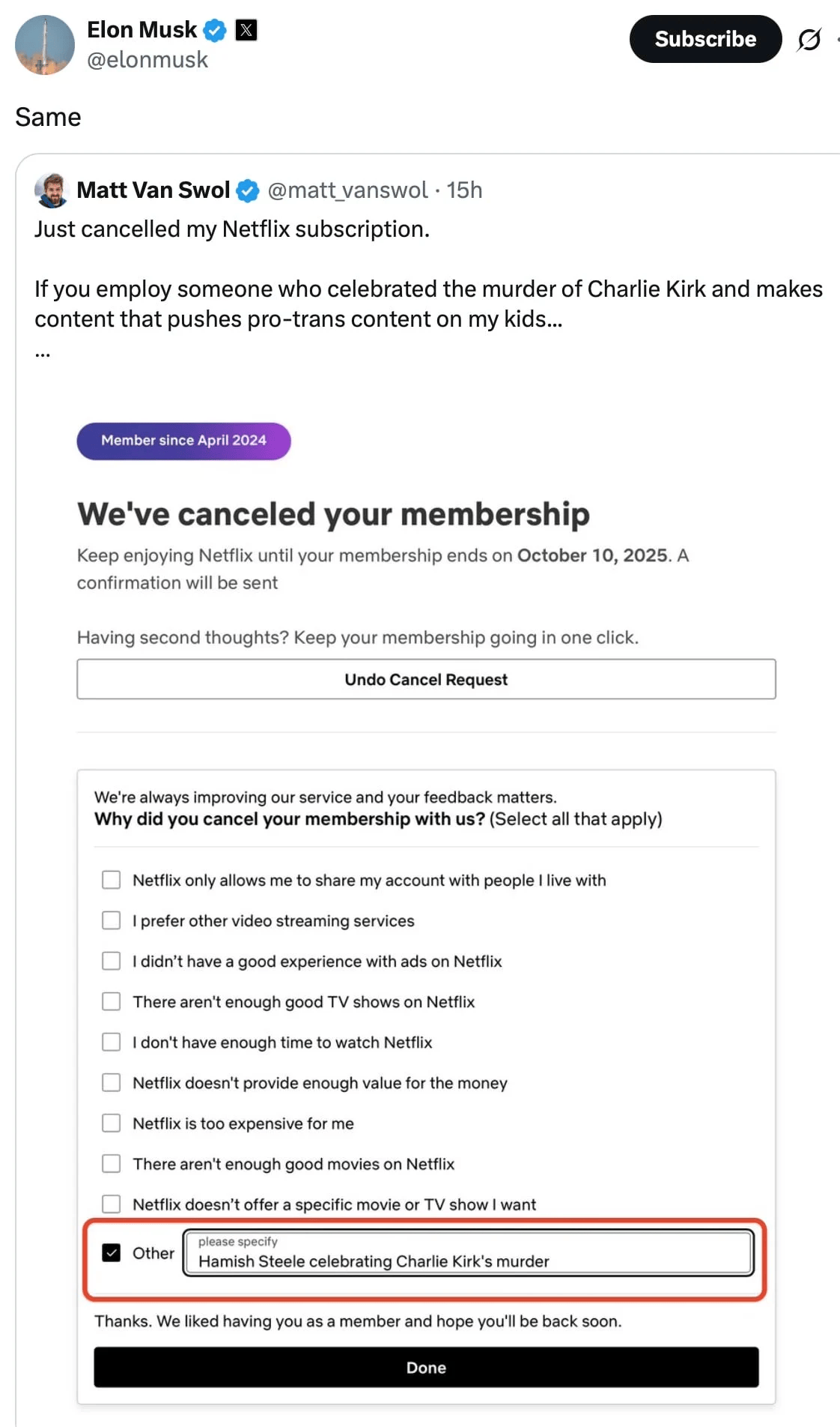 Η επίθεση στο Netflix δείχνει πως ο Μασκ παραμένει σταθερά αφοσιωμένος στην καταπολέμηση κάθε εκδήλωσης της «woke» κουλτούρας, ανεξαρτήτως του κόστους ή του θεσμού που αφορά όταν δεν χρησιμοποιεί «επικίνδυνη και εμπρηστική» γλώσσα σε ακροδεξιές συγκέντρωσεις όπως συνέβη πρόσφατα στο Λονδίνο.
