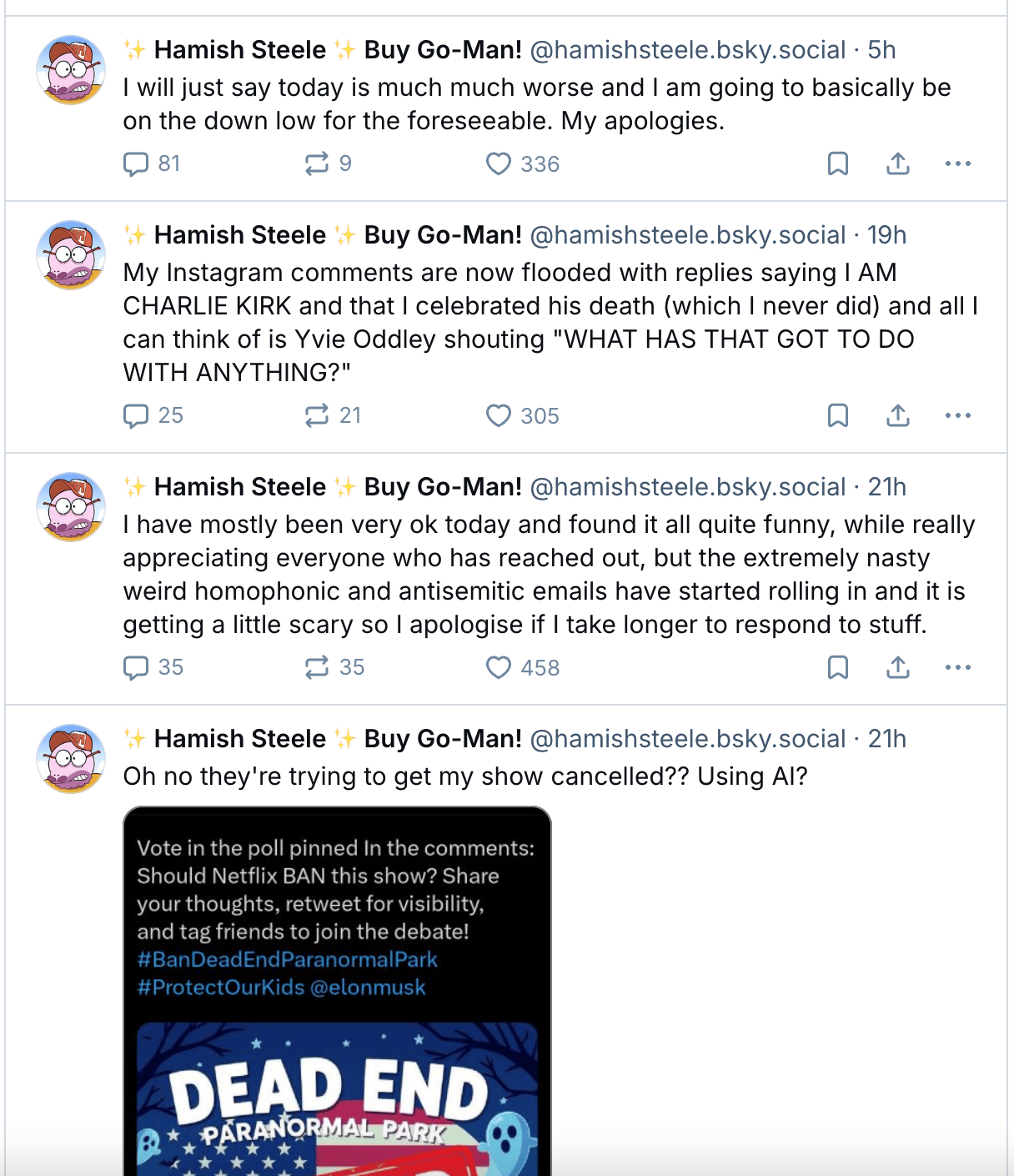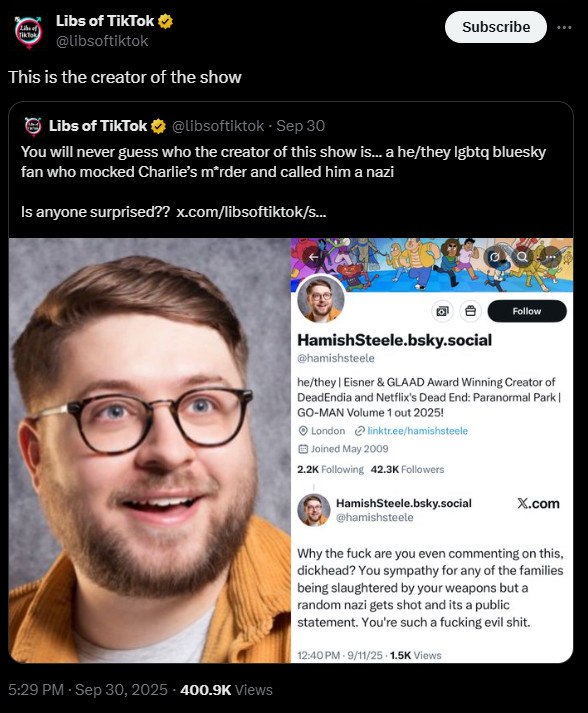 Η κριτική του Μασκ επεκτάθηκε και στον δημιουργό της σειράς, Χάμις Στιλ. Ο Μασκ αναδημοσίευσε μία ανάρτηση που υποτίθεται ότι ανήκε στον Στιλ, όπου ο δημιουργός εξέφραζε πολύ σκληρό λεξιλόγιο προς τον Πρωθυπουργό του Ηνωμένου Βασιλείου, Κιρ Στάρμερ, ενώ έδειχνε να υπερασπίζεται τη δολοφονία του ακροδεξιού influencer των MAGA Τσάρλι Κερκ.