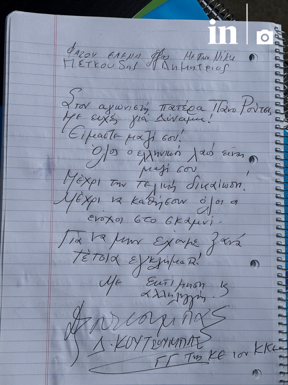 Ο ΓΓ της ΚΕ του ΚΚΕ Δημήτρης Κουτσούμπας, όταν η απεργιακή συγκέντρωση του ΠΑΜΕ, έφτασε στο Σύνταγμα, κατευθύνθηκε στο σημείο που πραγματοποιεί απεργία πείνας ο Πάνος Ρούτσι, όπου συναντήθηκε με την Ελένη Βασάρα, Γραμματέα του Συλλόγου Συγγενών Θυμάτων Τεμπών, τον Γιώργο Τσακλίδη και άλλους συγγενείς των θυμάτων των Τεμπών και έγραψε το ακόλουθο μήνυμα στο βιβλίο αλληλεγγύης: «Στον αγωνιστή πατέρα Πάνο Ρούτσι, με ευχές για δύναμη! Είμαστε μαζί σου! Όλος ο ελληνικός λαός είναι μαζί σου. Μέχρι την τελική δικαίωση! Μέχρι να καθίσουν όλοι οι ένοχοι στο σκαμνί. Για να μην έχουμε ξανά τέτοια εγκλήματα! Με εκτίμηση και αλληλεγγύη».
