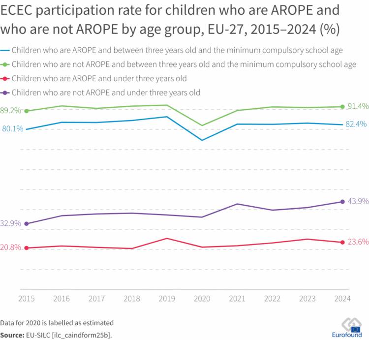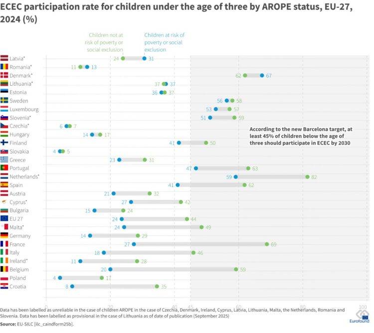 Ωστόσο, μόνο τα μισά μικρά παιδιά που κινδυνεύουν από φτώχεια ή κοινωνικό αποκλεισμό (AROPE) επωφελήθηκαν από τα προγράμματα (23,6%) σε σύγκριση με τα παιδιά που δεν διατρέχουν κίνδυνο (43,9%) το 2024.