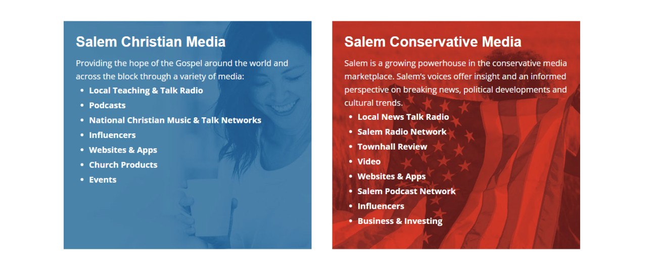 Επιπλέον, θα επιτρέψει την «ενσωμάτωση αφηγηματικών μηνυμάτων στις ιδιοκτησίες του Salem Media Network και σε ευθυγραμμισμένα κανάλια διανομής». Το Salem Media Network είναι ένα συντηρητικό χριστιανικό δίκτυο μέσων ενημέρωσης στις ΗΠΑ.