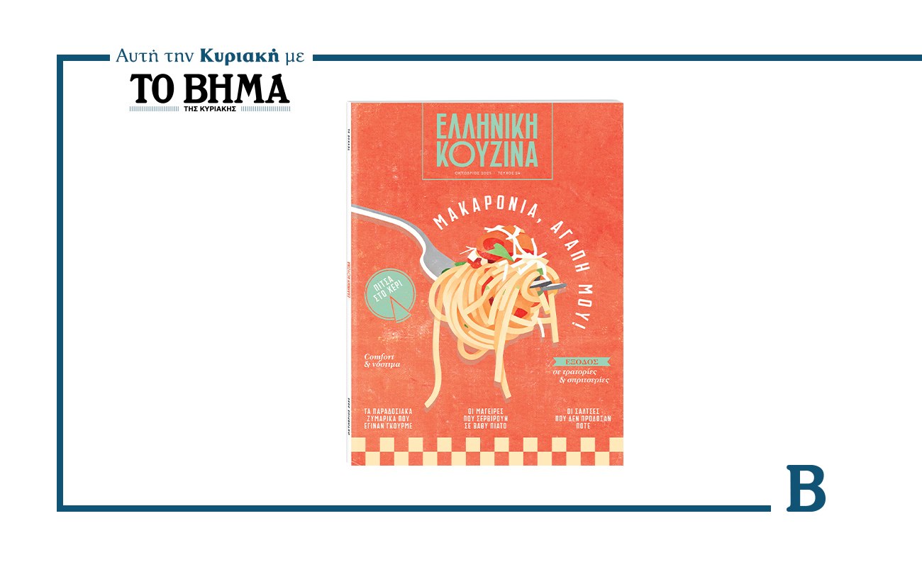Το νέο τεύχος του περιοδικού «Ελληνική Κουζίνα», που κυκλοφορεί αυτή την Κυριακή 5 Οκτωβρίου με την εφημερίδα το ΒΗΜΑ, είναι αφιερωμένο στις πιο λαχταριστές μακαρονάδες – από τις παραδοσιακές με κόκορα ή μοσχαράκι μέχρι τις γρήγορες και απολαυστικές εκδοχές που σώζουν την ημέρα.