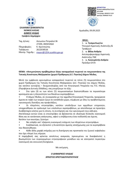 Παράλληλα, διαθέσαμε κονδύλια για την ασφαλή ταφή των νεκρών ζώων, σε κατάλληλους χώρους και με όλες τις προβλεπόμενες υγειονομικές προφυλάξεις. Η κτηνοτροφία της Πηνείας δεν μπορεί να αφεθεί στην τύχη της. Χρειάζονται άμεσες αποφάσεις και συντονισμένες δράσεις από το Υπουργείο και την Περιφέρεια. Ο Δήμος Ήλιδας θα συνεχίσει να βρίσκεται στο πλευρό των κτηνοτρόφων και να διεκδικεί λύσεις για τη βιωσιμότητα της τοπικής μας παραγωγής».
