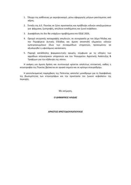 Η ανάγκη για άμεση δράση και συντονισμό κρίνεται απολύτως επιτακτική, καθώς η κτηνοτροφία της Πηνείας -κύρια πηγή εισοδήματος της περιοχής- βρίσκεται σε οριακό σημείο.