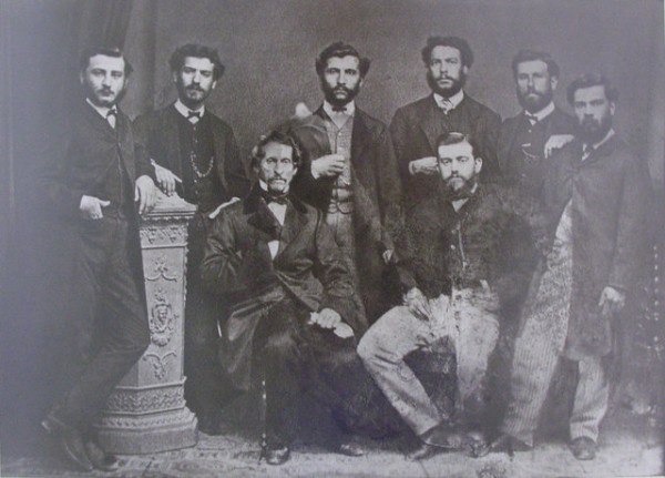 Ο Χρηστομάνος, δεύτερος από αριστερά μεταξύ των ορθίων (δίπλα του, πρώτος από αριστερά, ο καθηγητής Ξαβέριος Λάνδερερ, που δίδαξε πρώτος τη χημεία στην Ελλάδα σε πανεπιστημιακό επίπεδο)