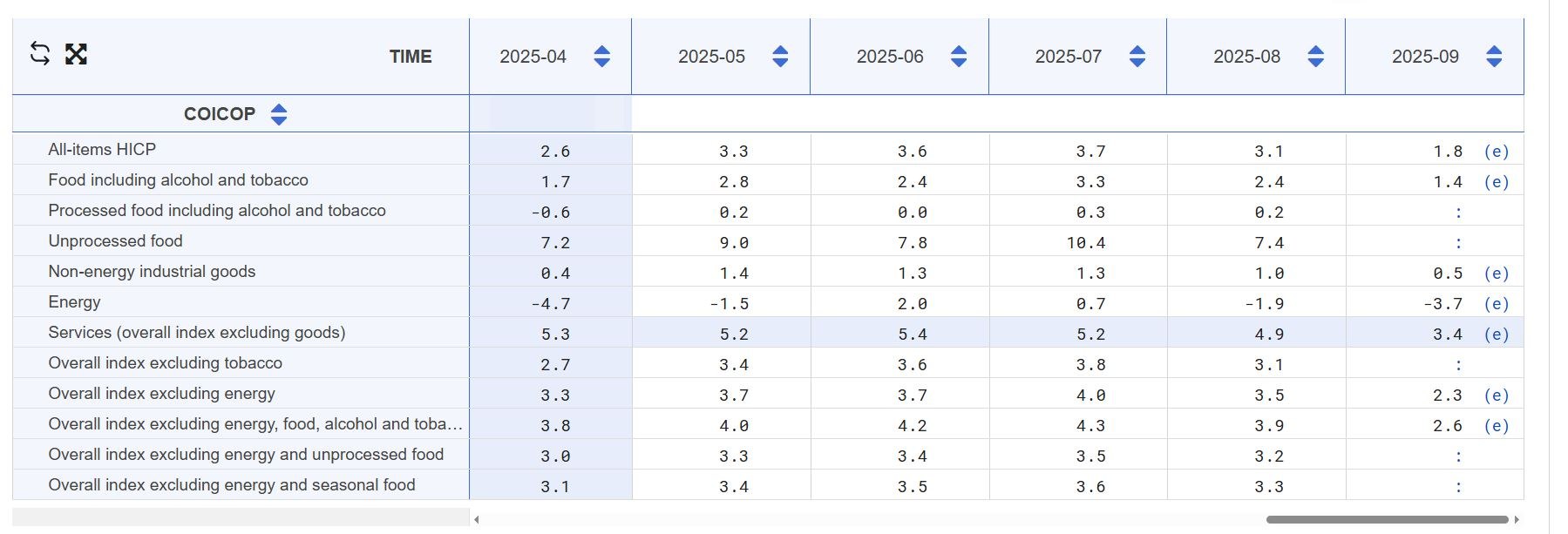 Από την ανάγνωση των επί μέρους στοιχείων της Εurostat, προκύπτει ότι η βασική αιτία για την επιβράδυνση του εναρμονισμένου πληθωρισμού στην Ελλάδα είναι η αποκλιμάκωση των τιμών ενέργειας. Τα ενεργειακά αγαθά είχαν αρνητικό πληθωρισμό, με την υποχώρηση να εκτιμάται στο -3,7% σε σύγκριση με τον Σεπτέμβριο του 2024.
