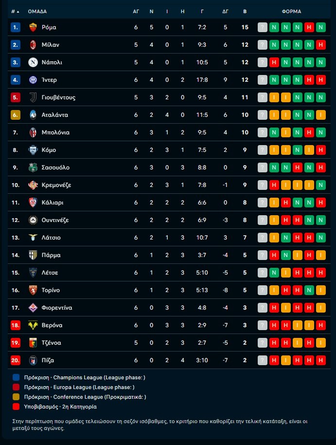 Την ίδια ώρα η ομάδα του Κώστα Τσιμίκα έφτασε τους 15 βαθμούς και είναι μόνη πρώτη στη βαθμολογία καθώς τα παιχνίδια της Νάπολι και της Μίλαν (εκτός έδρας ντέρμπι με τη Γιουβέντους) εκκρεμούν.