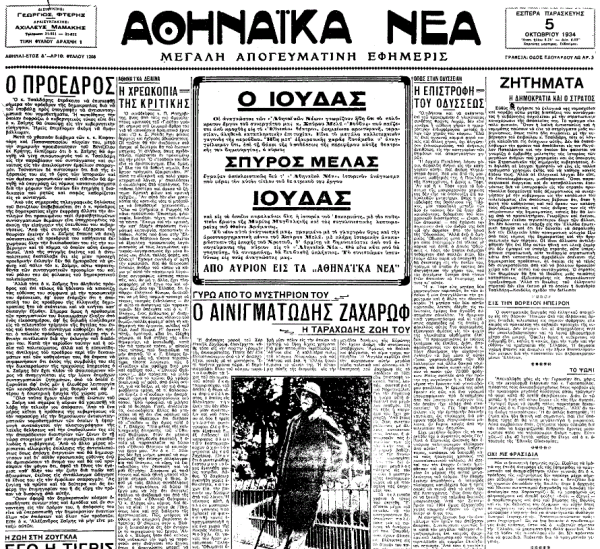 Ένα από τα πρωτοσέλιδα άρθρα της εφημερίδας «Αθηναϊκά Νέα» που είχε κυκλοφορήσει την Παρασκευή 5 Οκτωβρίου 1934 ήταν αφιερωμένο στον «αινιγματώδη» Μπάζιλ Ζαχάρωφ και στην «ταραχώδη ζωή» του.