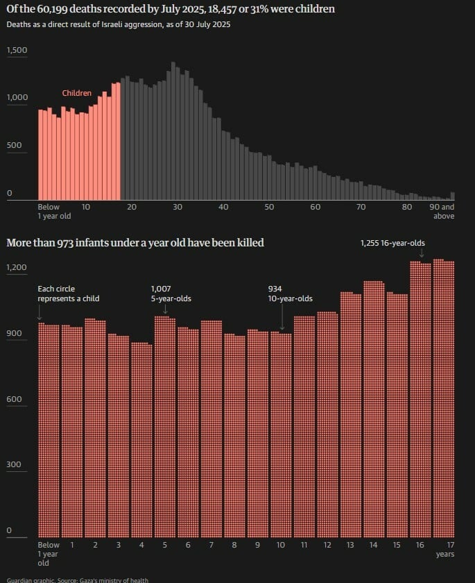 Στα τέλη Ιουλίου, ο κατάλογος των νεκρών στη Γάζα περιλάμβανε 60.199 ονόματα, εκ των οποίων τα 18.457 ήταν κάτω των 18 ετών. Ο Guardian δημοσιεύει τα ονόματά τους.