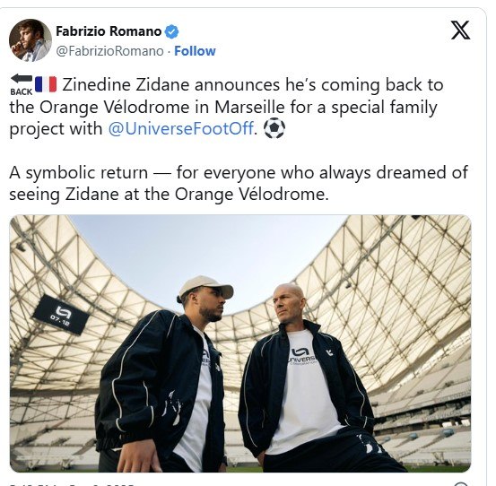 Ο Ζιντάν επιβεβαίωσε ότι θα επιστρέψει στο ποδόσφαιρο για αυτό που περιγράφει ως ένα «ιδιαίτερο οικογενειακό πρότζεκτ» στην πατρίδα του, τη Μασσαλία. Σύμφωνα με τον Φαμπρίτσιο Ρομάνο, ο 53χρονος θρύλος του Γαλλικού ποδοσφαίρου συνεργάζεται με την Universe Football για μια μεγάλη εκδήλωση που αναμένεται να πραγματοποιηθεί στο Στάδιο Βελοντρόμ, στην έδρα της Ολιμπίκ Μαρσέιγ. Οι λεπτομέρειες παραμένουν μυστικές. Το μόνο που έχει διαρρεύσει είναι ότι θα πρόκειται για έναν αγώνα ποδοσφαιρικών θρύλων που θα συγκεντρώσει μερικά από τα μεγαλύτερα ονόματα του ποδοσφαίρου και διασημότητες και ότι ο Ζιντάν θα θυμίσει και τις ικανότητές του στο τόπι.