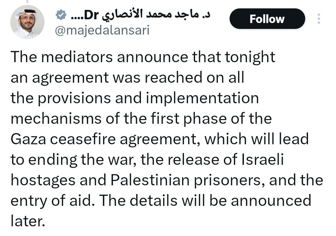 Ο εκπρόσωπος του υπουργείου Εξωτερικών του Κατάρ επιβεβαίωσε την επίτευξη συμφωνίας για όλες τις πτυχές και τους μηχανισμούς εφαρμογής της πρώτης φάσης της ειρηνευτικής συμφωνίας για τη Γάζα