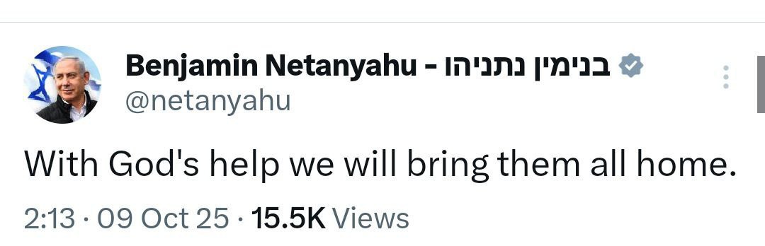 Συνέχισε ευχαριστώντας από τα βάθη της καρδιάς του «τον Πρόεδρο Τραμπ και την ομάδα του για την κινητοποίησή τους για αυτή την ιερή αποστολή της απελευθέρωσης των ομήρων μας». Έκλεισε γράφοντας πως «με τη βοήθεια του Παντοδύναμου, μαζί θα συνεχίσουμε να επιτυγχάνουμε όλους τους στόχους μας και να επεκτείνουμε την ειρήνη με τους γείτονές μας».