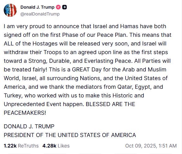 Ο Ντόναλντ Τραμπ ανακοίνωσε την υπογραφή της πρώτης φάσης του σχεδίου ειρήνης γράφοντας «Είμαι πολύ περήφανος που ανακοινώνω ότι το Ισραήλ και η Χαμάς υπέγραψαν την πρώτη φάση του ειρηνευτικού μας σχεδίου. Αυτό σημαίνει ότι ΟΛΟΙ οι όμηροι θα απελευθερωθούν πολύ σύντομα και το Ισραήλ θα αποσύρει τα στρατεύματά του σε μια συμφωνημένη γραμμή, ως πρώτο βήμα προς μια ισχυρή, διαρκή και αιώνια ειρήνη».