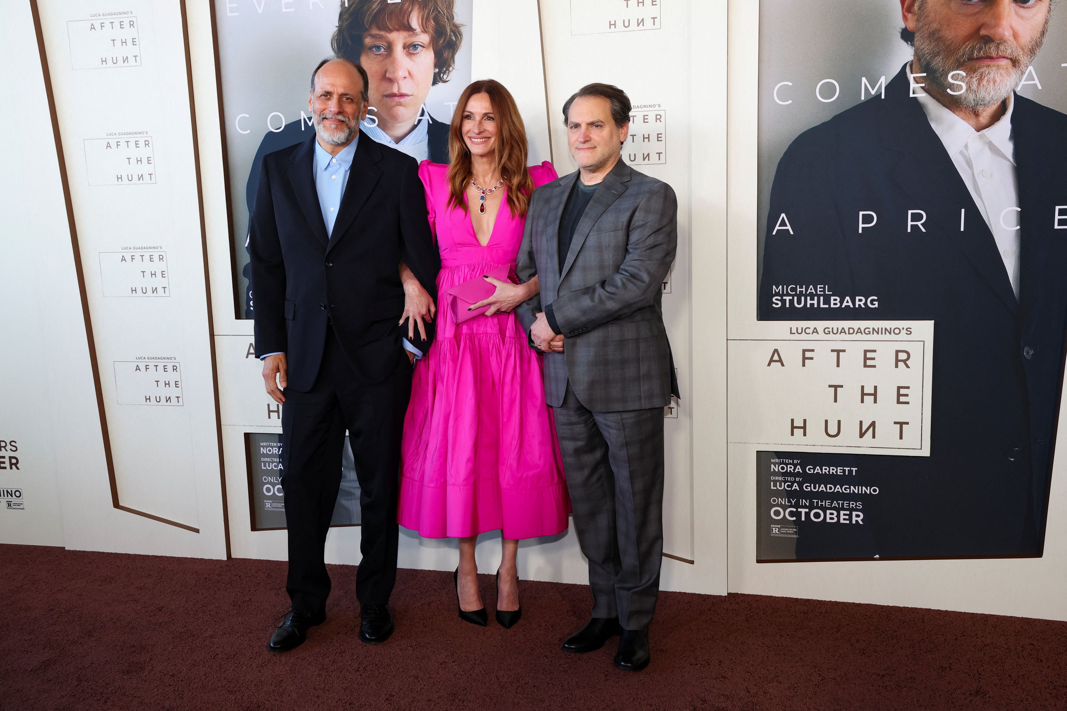 Φωτογραφία: Ο σκηνοθέτης Λούκα Γκουαντίνινο και οι ηθοποιοί Τζούλια Ρόμπερτς και Μάικλ Στούλμπαργκ παρευρίσκονται σε ειδική προβολή της ταινίας «After the Hunt» στο Λος Άντζελες, Καλιφόρνια, ΗΠΑ, στις 4 Οκτωβρίου 2025. REUTERS/Mario Anzuoni