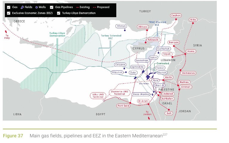 Στην ίδια έκθεση γίνεται αναφορά στο πρόβλημα της εκμετάλλευσης των αποθεμάτων φυσικού αερίου που ανακαλύφθηκαν πρόσφατα στα ύδατα της Κυπριακής Δημοκρατίας τα οποία αποτελούν «θέμα διχογνωμίας μεταξύ Κύπρου και Τουρκίας, καθώς η Άγκυρα δεν έχει υπογράψει ούτε κυρώσει τη Σύμβαση των Ηνωμένων Εθνών για το Δίκαιο της Θάλασσας (UNCLOS) και ισχυρίζεται ότι η Κυπριακή Δημοκρατία δεν έχει την κυριαρχία να εξερευνήσει και να εκμεταλλευτεί τους υπεράκτιους πόρους χωρίς τη σύναψη συμφωνίας με την τουρκική οντότητα της «Τουρκικής Δημοκρατίας της Βόρειας Κύπρου», η οποία, κατά την τουρκική αντίληψη, έχει ίσα δικαιώματα να εκδίδει άδειες εκμετάλλευσης για τα αποθέματα φυσικού αερίου που βρίσκονται στα ανοικτά των ακτών του νησιού».
