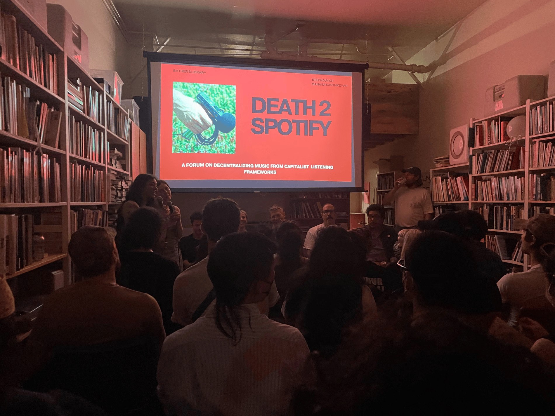 Το Death to Spotify ξεκίνησε ωςμια σειρά ομιλιών στο Σαν Φρανσίσκο για να γίνει η συλλογική προσπάθεια καλλιτεχνών και ακροατών να «αποκεντροποιήσουν τη μουσική ανακάλυψη από τις παθογένειες των καπιταλιστικών οικονομιών» σημειώνει ο The Guardian.