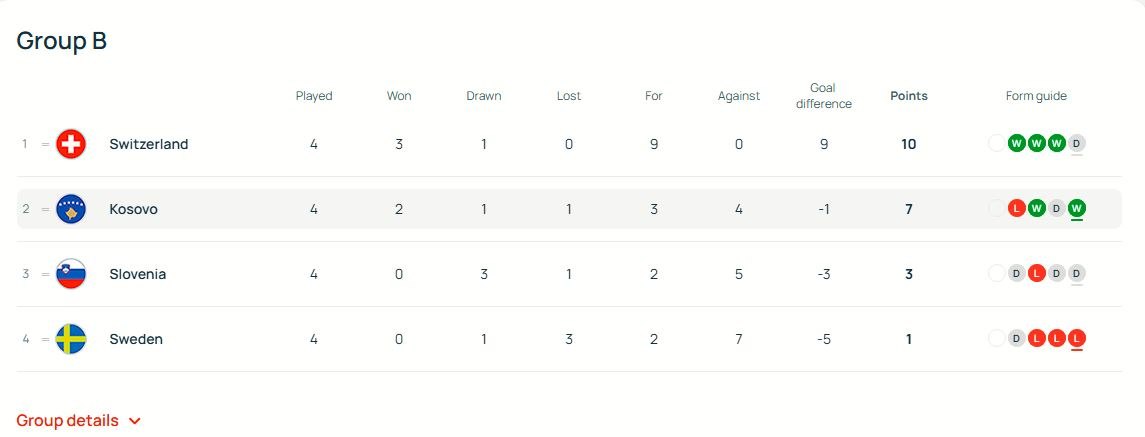 Η Σουηδία έχασε ξανά από το Κόσοβο και αποχαιρέτησε και μαθηματικά τις ελπίδες που είχε για πρόκριση στο Μουντιάλ. το μοναδικό γκολ της αναμέτρησης πέτυχε ο Ασλάνι στο 31ο λεπτό της αναμέτρησης, έπειτα από ασίστ του Χότζα. Στο άλλο ματς του ομίλου, Σλοβενία και Ελβετία έμειναν στο 0-0.
