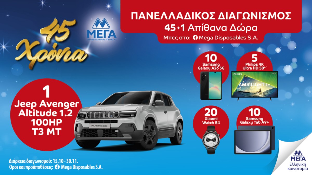 45 χρόνια ΜΕΓΑ σημαίνουν 45 χρόνια εμπιστοσύνης και ένα μεγάλο “ευχαριστώ”. Η 100% ελληνική εταιρεία γιορτάζει τα 45 χρόνια λειτουργίας της, διοργανώνοντας έναν μεγάλο πανελλαδικό διαγωνισμό, δίνοντας την ευκαιρία στους καταναλωτές να διεκδικήσουν 45 + 1 απίθανα δώρα!