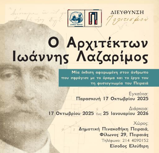 Η Διεύθυνση Πολιτισμού του Δήμου Πειραιά εγκαινιάζει την Παρασκευή 17 Οκτωβρίου 2025, στις 19:30, στη Δημοτική Πινακοθήκη Πειραιά (Φίλωνος 29), την έκθεση «Ο Αρχιτέκτων Ιωάννης Λαζαρίμος», με ελεύθερη είσοδο για το κοινό.