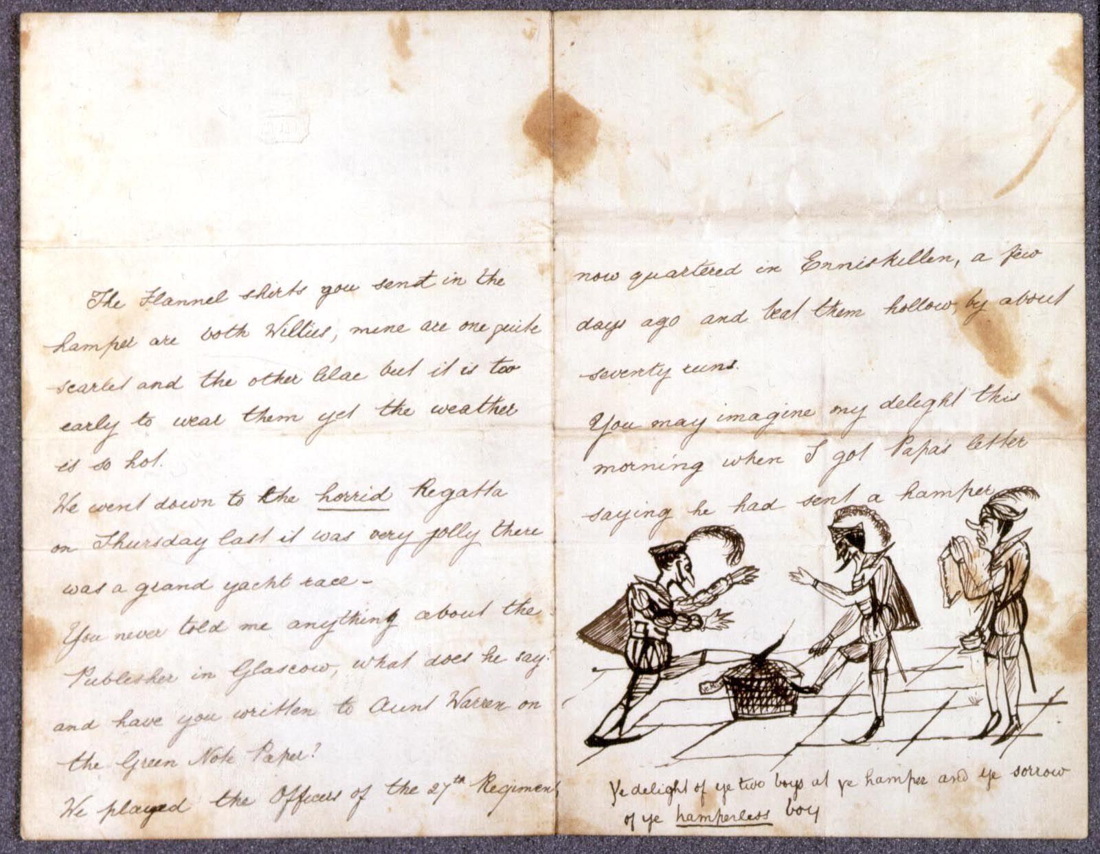 Επιστολή του Όσκαρ Ουάιλντ από έκθεση της Βρετανικής Βιβλιοθήκης. Η επιστολή γράφτηκε από τον Ουάιλντ όταν ήταν μόλις 14 ετών και απευθυνόταν στη μητέρα του την οποία και ευχαριστούσε για ένα καλάθι με εδέσματα που είχε λάβει στο οικοτροφείο του, στο Ενισκίλεν. Η επιστολή περιλαμβάνει ένα σκίτσο στο οποίο απεικονίζεται ο ίδιος και ο αδελφός του, Γουίλι, να απολαμβάνουν το περιεχόμενο του καλαθιού, ενώ ένας δυσαρεστημένος συμμαθητής τους παρακολουθεί.