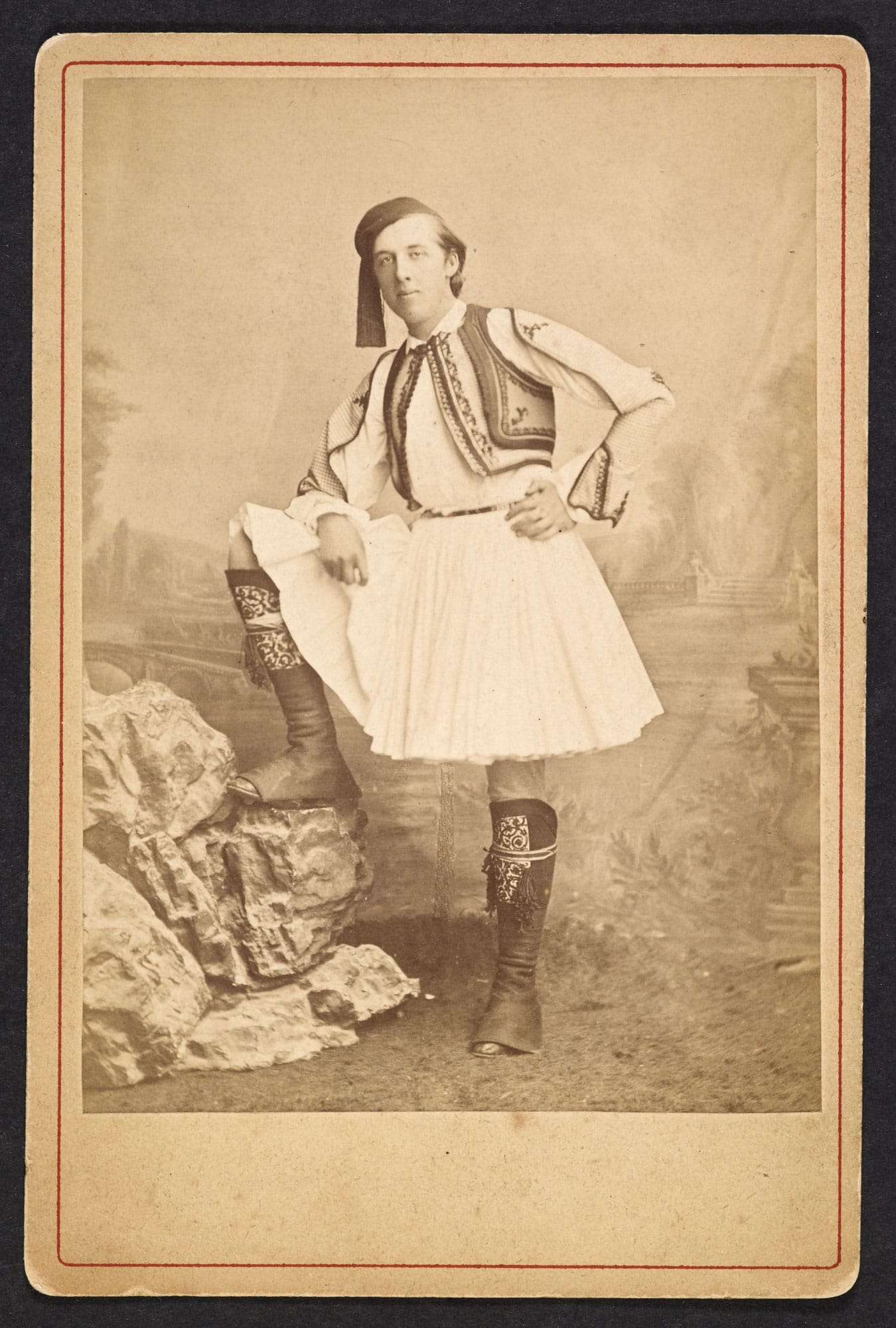 O Oυάιλντ ντυμένος τσολιάς μετά από ταξίδι του στην Ελλάδα το 1877. Ο Ιρλανδός πρωτοπόρος ήταν εραστής του Ελληνισμού και είχε γράψει ποιημάτα για τον Ελληνισμό αποθεώνοντας το κριτικό πνεύμα που κληροδότησε σε όλους