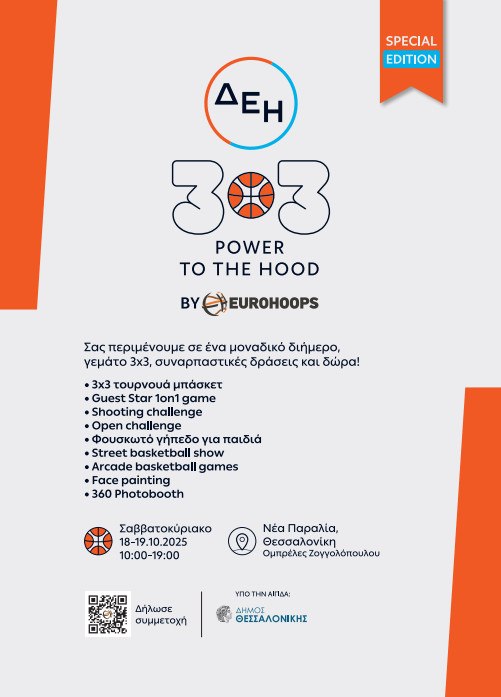 Το ΔΕΗ 3×3 POWER TO THE HOOD by Eurohoops | Special Edition έρχεται στη Νέα Παραλία Θεσσαλονίκης και τις Ομπρέλες Ζογγολόπουλου το Σαββατοκύριακο 18 & 19 Οκτωβρίου 2025 και φέρνει μαζί του το GUEST STAR 1on1 GAME, στο πλαίσιο των ψυχαγωγικών του δράσεων.