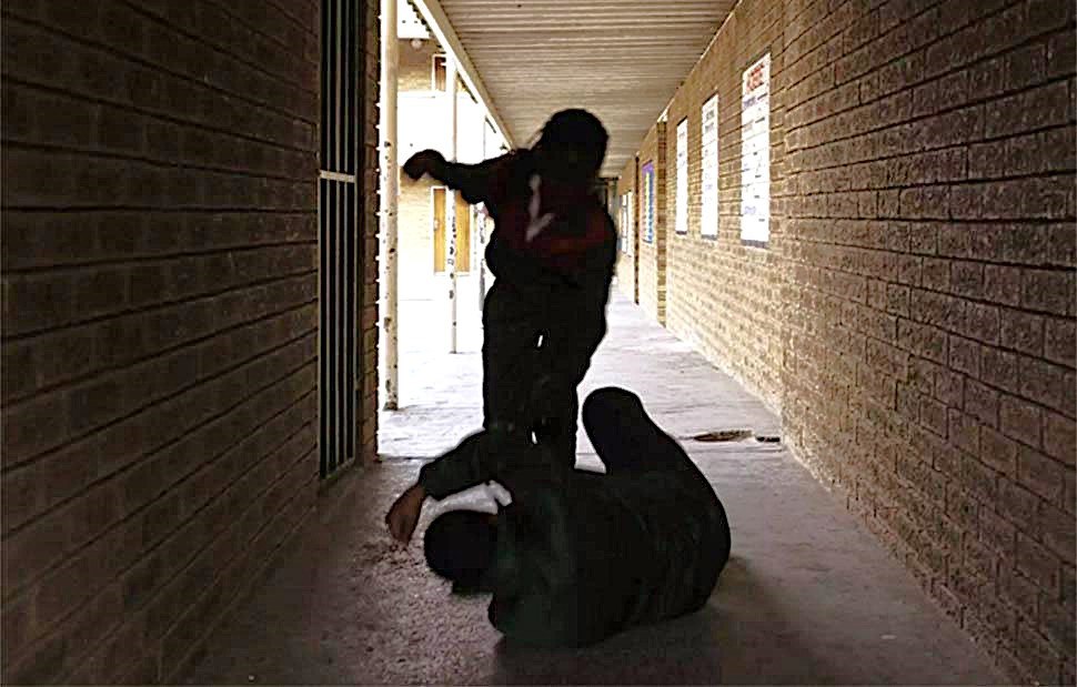 Δύο νεαροί πιάστηκαν στα χέρια, ενώ οι συμμαθητές τους κατέγραφαν το περιστατικό με τα κινητά τηλέφωνα και επευφημούσαν, φωνάζοντας «μπουνιά, μπουνιά».