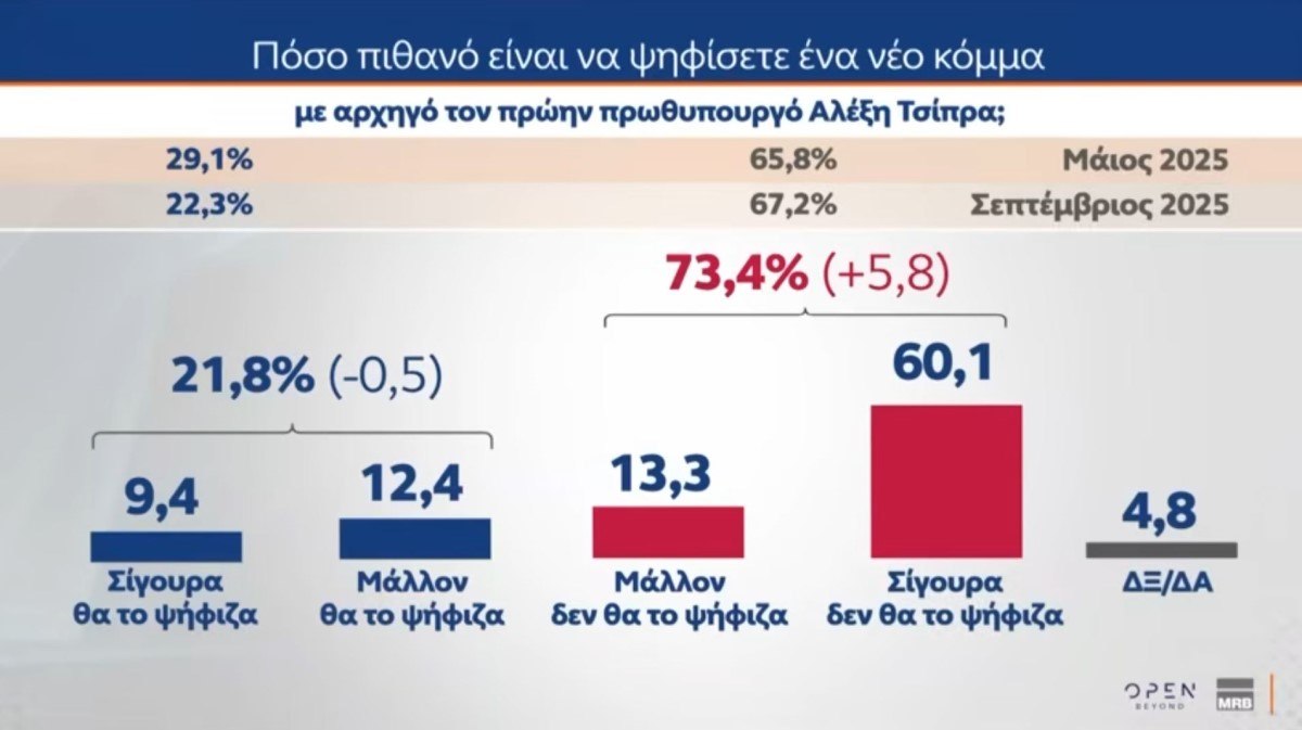 Στην ερώτηση «πόσο πιθανό είναι να ψηφίσετε ένα νέο κόμμα με αρχηγό τον πρώην πρωθυπουργό Αλέξη Τσίπρα», το 73,4% των ερωτηθέντων απαντά «σίγουρα/μάλλον δεν θα το ψήφιζα», το 21,8% ότι «σίγουρα/μάλλον θα το ψήφιζα» και ένα 4,8% «δεν ξέρω/δεν απαντώ».