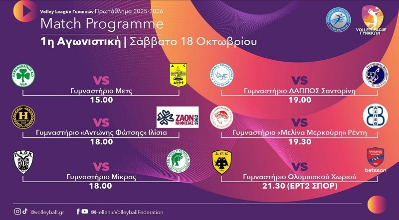 Αναλυτικά, το πρόγραμμα της 1ης αγωνιστικής της Volley League Γυναικών: