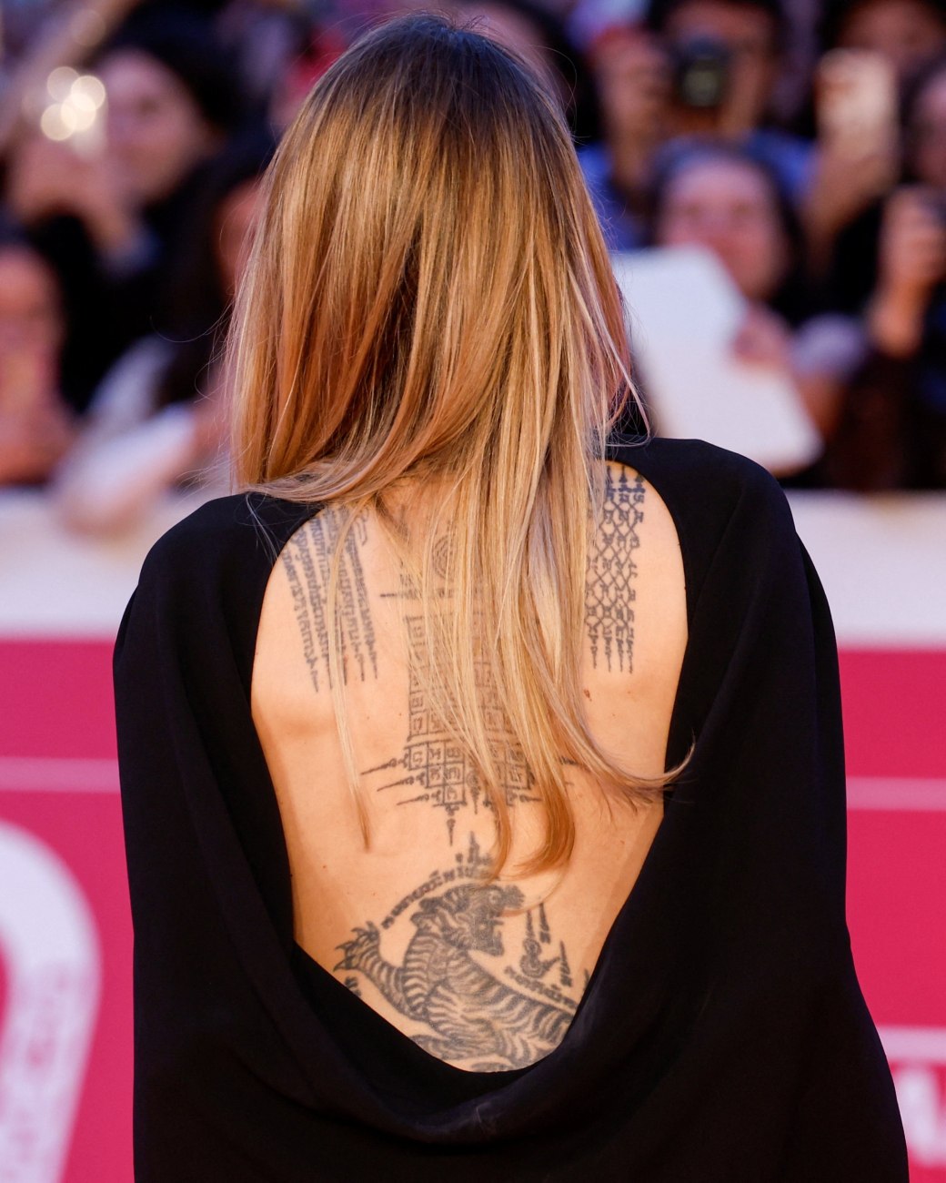 Η Αντζελίνα Τζολί επέλεξε ένα μαύρο φόρεμα με ανοιχτή πλάτη, το οποίο αναδείκνυε τα τατουάζ της, τα οποία περιλαμβάνουν μια τίγρη και ευχές για ειρήνη.