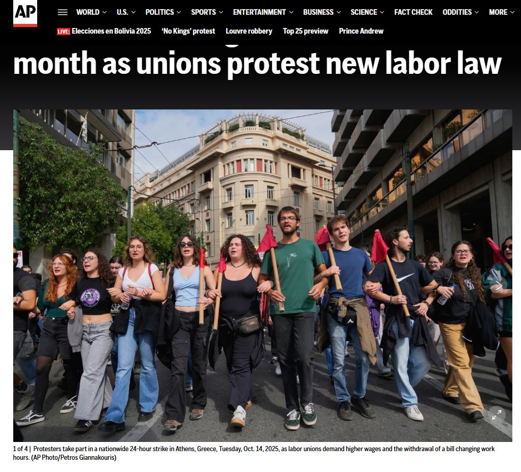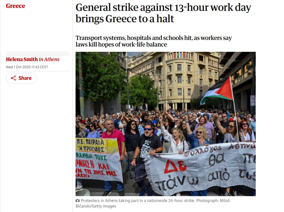 Η Ελλάδα «ταξιδεύει»… Στη Χαράρε, το Νέο Δελχί, το Μπακού και από εκεί στο Παρίσι, το Λονδίνο και το Βερολίνο. Το «13ωρο Κεραμέως» (που πρόσφατα έγινε νόμος τους κράτους) φιγουράρει στον διεθνή Τύπο, όχι για να εξυμνήσει τη χώρα μας. Οι απεργιακές κινητοποιήσεις των συνδικάτων κόντρα στο «αντεργατικό νομοσχέδιο» κέρδισαν περίοπτη θέση στα διεθνή ΜΜΕ ενώ η κριτική «πένα» των συναδέλφων, εκτός συνόρων, σημειώνει πως η κυβέρνηση Μητσοτάκη έχει μετατρέψει την αγορά εργασίας στη χώρα μας σε μια από τις πιο ευέλικτες στην Ευρώπη.