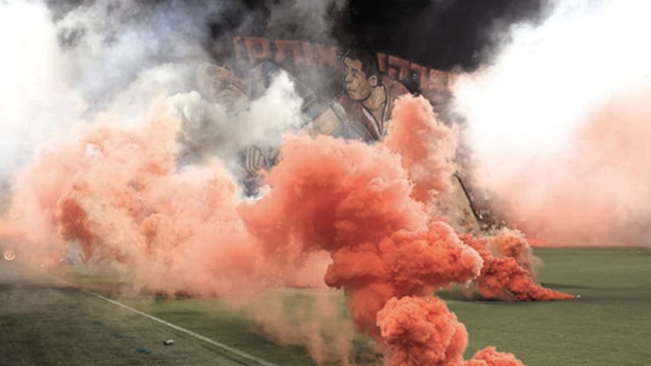 Στο γήπεδο της Χάποελ, όπου παραβρέθηκαν 25000 οπαδοί, η ατμόσφαιρα θύμιζε… πόλεμο. Καπνογόνα, πέτρες, μπουκάλια και πυροτεχνήματα πετάγονταν από παντού, κάτι που έκρινε αδύνατη την έναρξη του παιχνιδιού.