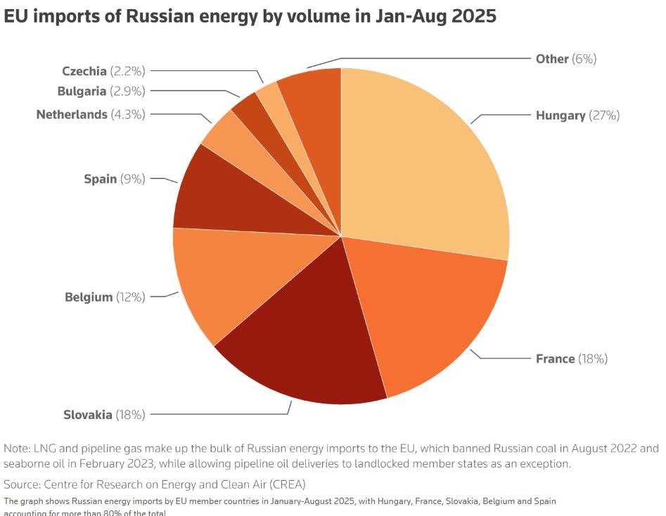 Μπορεί το μπλογκ να έχει μειώσει την εξάρτησή της από τη Ρωσία, τον κάποτε κυρίαρχο προμηθευτή της, κατά περίπου 90% από το 2022, ωστόσο στο πρώτο 8μηνο του 2025 εισήγαγε ρωσική ενέργεια αξίας άνω των 11,4 δισ. ευρώ, σύμφωνα με ανάλυση του Reuters σε δεδομένα του Centre for Research on Energy and Clean Air (CREA), ανεξάρτητου ερευνητικού οργανισμού με έδρα το Ελσίνκι.