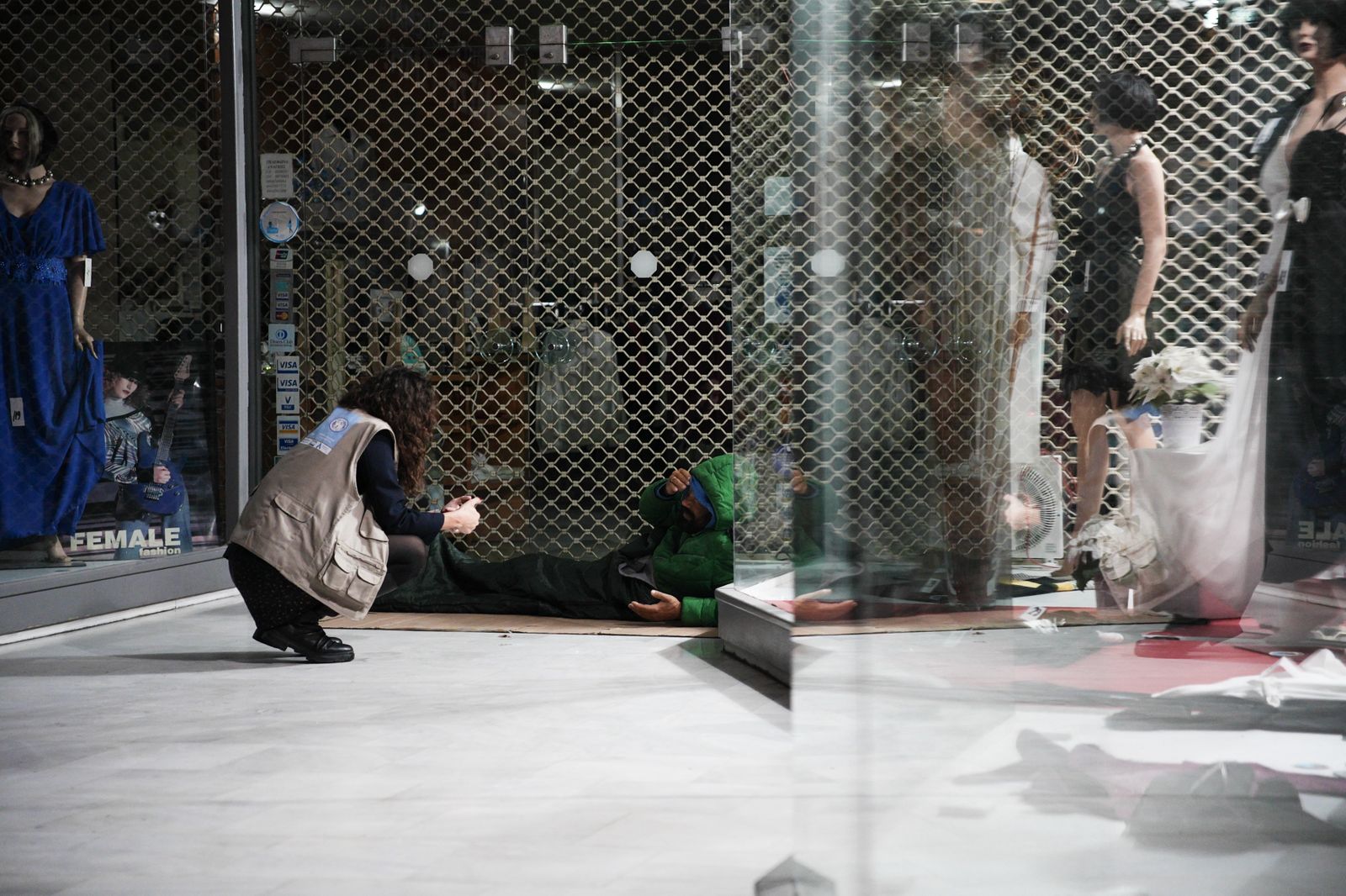 Λίγα λεπτά αργότερα, στη γωνία Αιόλου και Σταδίου, μία από τις ομάδες streetwork συναντά μια γυναίκα, που κουβαλά διαφορά υπάρχοντα σε δύο χαρτοσακούλες. Κάθεται με βλέμμα χαμένο στην είσοδο ενός πολυκαταστήματος. Η ομάδα των δύο κοινωνικών λειτουργών την πλησιάζει και τις απευθύνει μερικές ερωτήσεις.