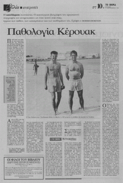 *Άρθρο που έφερε τον τίτλο «Παθολογία Κέρουακ» και είχε δημοσιευτεί στην εφημερίδα «Το Βήμα» την Κυριακή 27 Σεπτεμβρίου 1998. Συντάκτης του ανωτέρω κειμένου, που είχε φιλοξενηθεί αρχικά στο Book Review των New York Times (The New York Times Book Review – NYTBR), ήταν ο αμερικανός κριτικός λογοτεχνίας και συγγραφέας Morris Dickstein (1940-2021).
