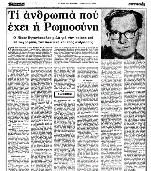 Στο φύλλο του «Βήματος» της 6ης Ιανουαρίου 1980 είχε συμπεριληφθεί μια συνέντευξη που είχε παραχωρήσει ο Εγγονόπουλος στο δημοσιογράφο Ανδρέα Δεληγιάννη, με αφορμή την πρόσφατη τότε βράβευσή του από την ελληνική πολιτεία για την ποιητική συλλογή του «Στην κοιλάδα με τους ροδώνες» (εκδόσεις «Ίκαρος», 1978).
