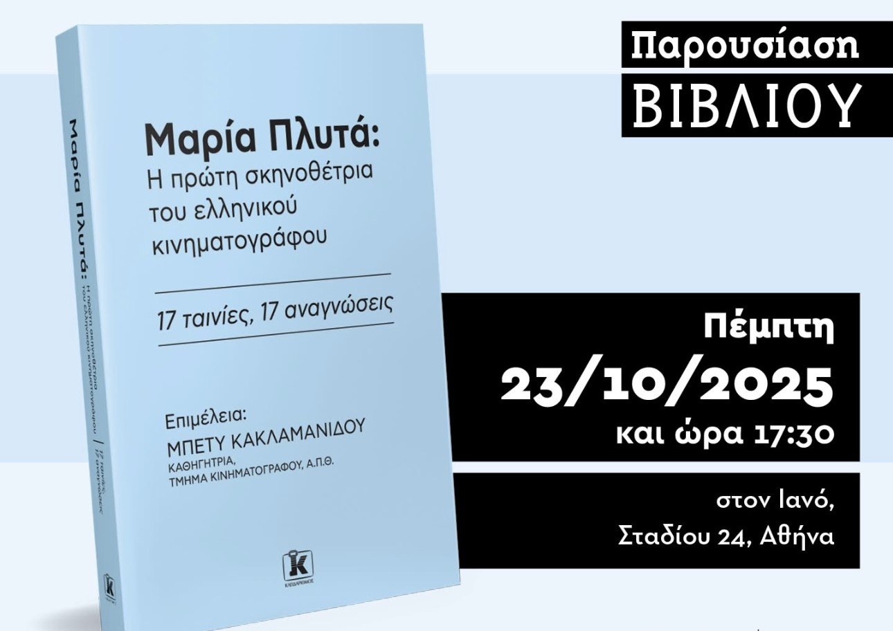 Ως αποτέλεσμα του τριετούς ερευνητικού προγράμματος «Ο Άγνωστος Κινηματογράφος της Μαρίας Πλυτά», την Πέμπτη 23 Οκτωβρίου, στις 17:30 στον Ιανό της οδού Σταδίου 24, θα παρουσιαστεί ο πρώτος συλλογικός τόμος με τίτλο «Μαρία Πλυτά: Η πρώτη σκηνοθέτρια του ελληνικού κινηματογράφου, 17 ταινίες, 17 αναγνώσεις» (εκδόσεις Κλειδάριθμος), σε επιμέλεια της Μπέτυς Κακλαμανίδου.