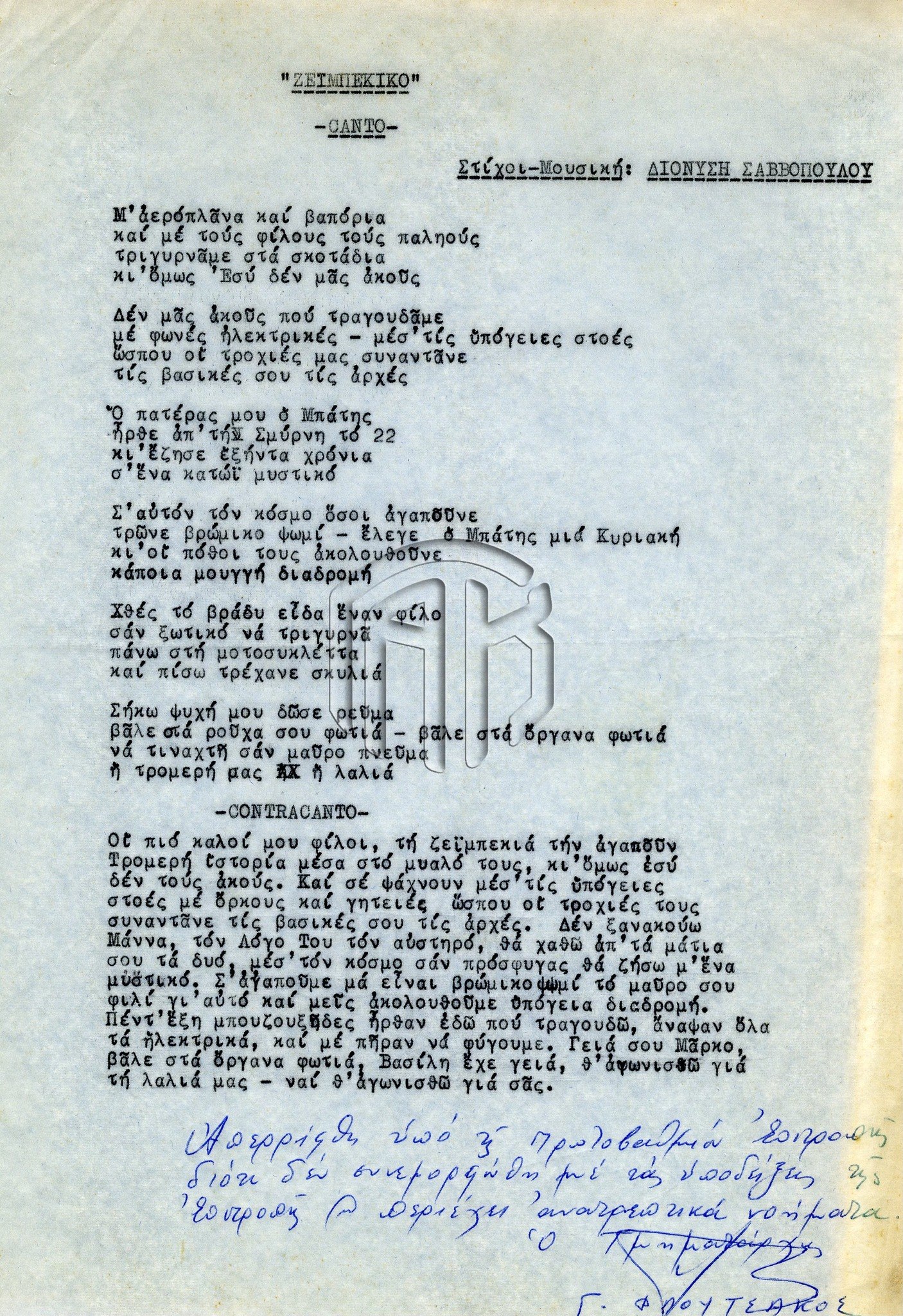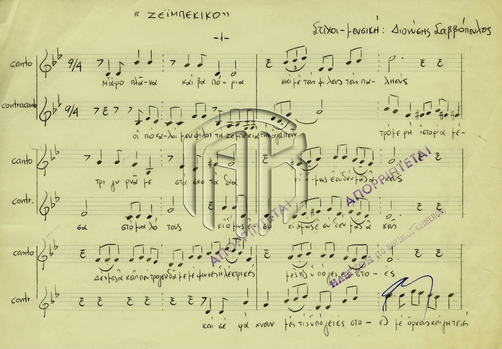 Το Ζεϊμπέκικο, αυτό το ατόφιο αριστούργημα που οι δύο κόσμοι της ροκ και του λαϊκού κάνουν έρωτα για να γεννήσουν ένα από τα πιο λατρεμένα, πολυτραγουδισμένα ζεϊμπέκικα της νέας ελληνικής ιστορίας -εκεί όπου η «λοξή» οπτική του Διονύση Σαββόπουλου και η αυθεντικότητα της Σωτηρίας Μπέλλου συνδιαλέγονται για να επικοινωνήσουν τον πόνο, την αντίσταση, την αξία της συλλογικής μνήμης.