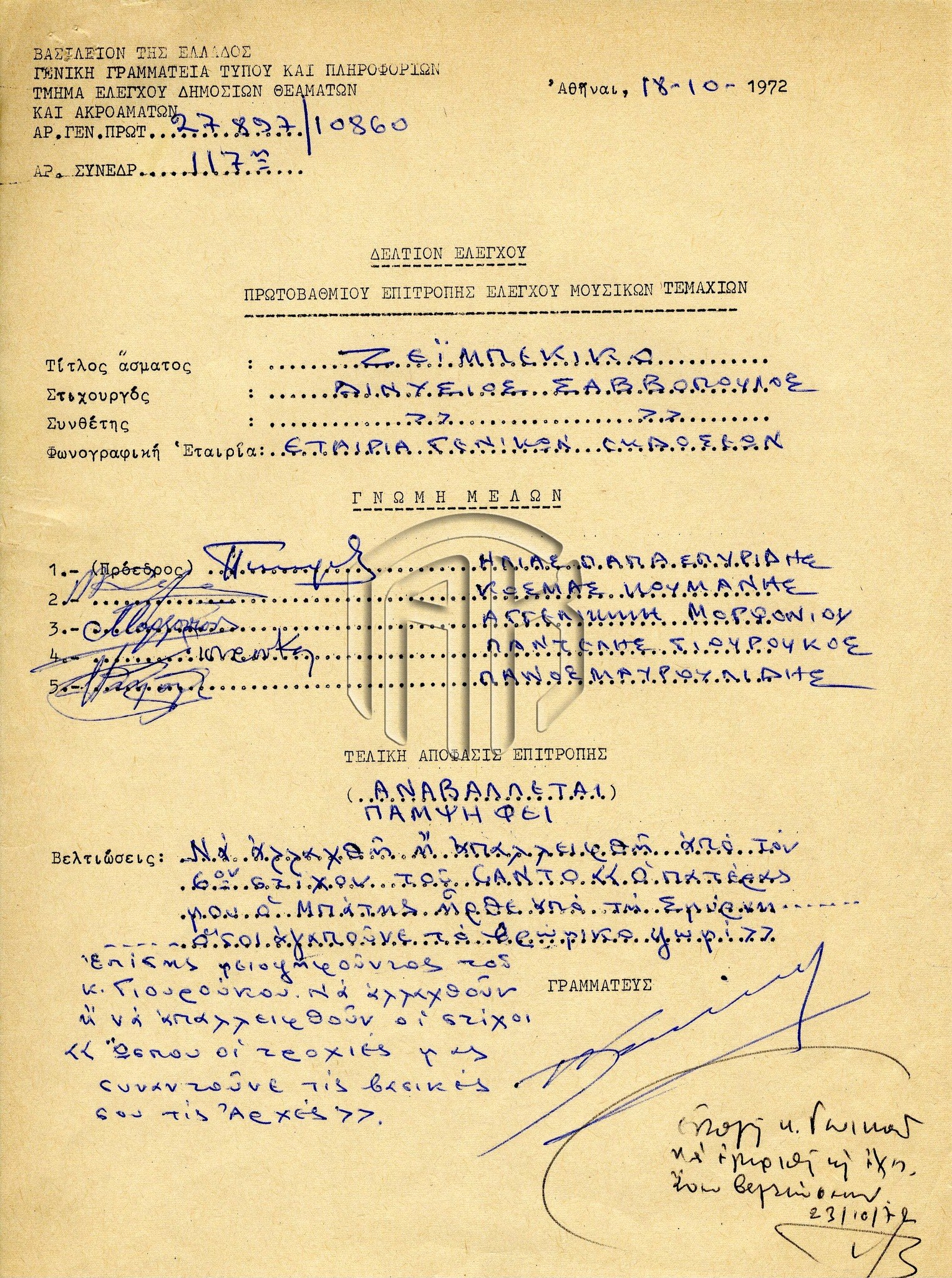 Τα τεκμήρια από τα Γενικά Αρχεία του Κράτους είναι αδιάψευστα: η Πρωτοβάθμιος Επιτροπή Ελέγχου Μουσικών Τεμαχίων απέρριψε το κομμάτι.
