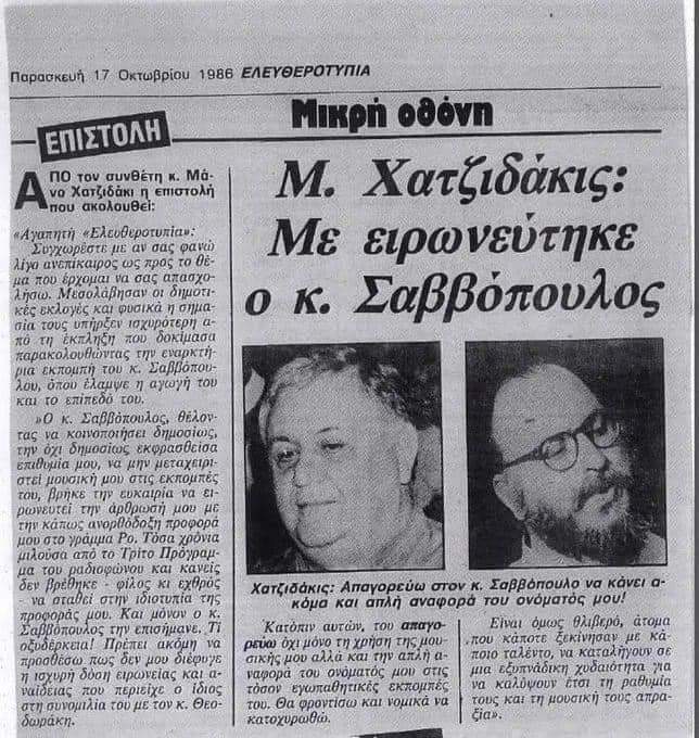 Η σχέση τους ωστόσο μοιάζει περίπλοκη. Το 1986, με επιστολή του στην ΕΛΕΥΘΕΡΟΤΥΠΙΑ, ο Μάνος Χατζιδάκις καταφέρεται με σκληρά λόγια εναντίον του Διονύση Σαββόπουλο, στον οποίο μάλιστα απαγόρευσε με την ίδια επιστολή, να κάνει οποιαδήποτε αναφορά στο όνομά του.