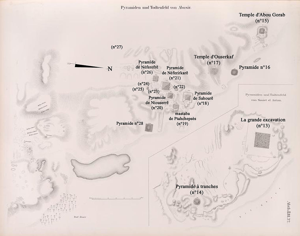 Χάρτης των Αμπούσιρ, Αμπού Γκοράμπ και Ζαουιέτ ελ Αριάν (Karl Richard Lepsius), με σχολιασμούς στα γαλλικά.