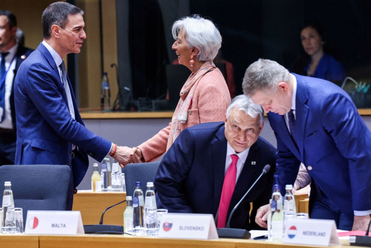 Ο Ισπανός πρωθυπουργός Πέδρο Σάντσεθ και η πρόεδρος της Ευρωπαϊκής Κεντρικής Τράπεζας (ΕΚΤ) Κριστίν Λαγκάρντ ανταλλάσσουν χειραψία δίπλα στον Ούγγρο πρωθυπουργό Βίκτορ Όρμπαν και τον πρωθυπουργό της Σλοβακίας Ρόμπερτ Φίκο, την ημέρα της συνόδου κορυφής της Ευρωπαϊκής Ένωσης στις Βρυξέλλες, Βέλγιο, 20 Μαρτίου 2020.