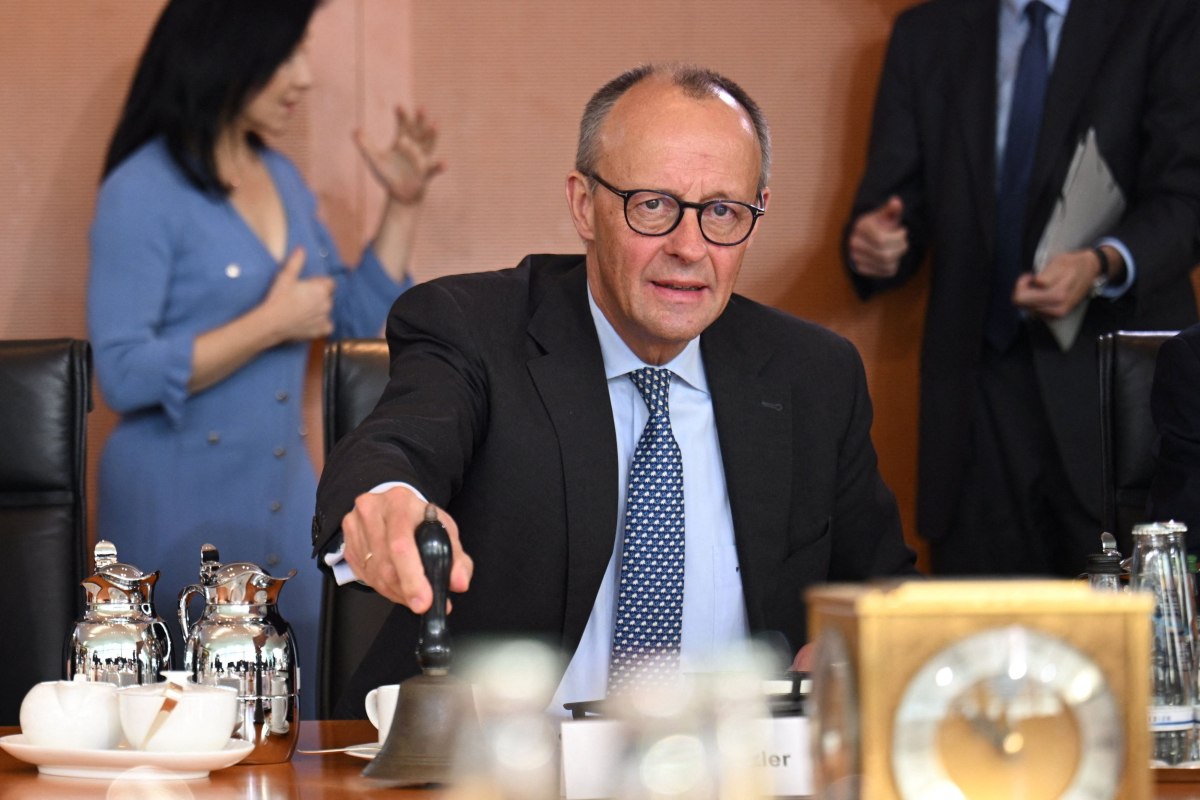 Ο Γερμανός καγκελάριος Φρίντριχ Μερτς χτυπάει ένα κουδούνι την ημέρα της συνεδρίασης του υπουργικού συμβουλίου στην Καγκελαρία στο Βερολίνο, Γερμανία, στις 22 Οκτωβρίου 2025.
